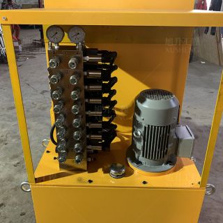 PLC同步頂升系統(tǒng)中的液壓泵站采用柱塞泵,在泵站上安裝了雙向截止閥,雙向截止閥能無泄漏的鎖住千斤頂,在發(fā)生意外停電的情況下能保證千斤頂不會自由下滑,使千斤頂所承負(fù)載不會因?yàn)榇朔N情況而失控。系統(tǒng)中還安裝有壓力變送器和位移監(jiān)測裝置,當(dāng)千斤頂移動時,壓力檢測裝置是可以實(shí)時精確的檢測到千斤頂所承受的負(fù)荷。同時位移檢測裝置可檢測到千斤頂?shù)膶?shí)時頂升位移高度。