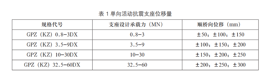 單向活動抗震支座位移量,橫橋向為 ±3mm,縱橋向位移量見表 1。