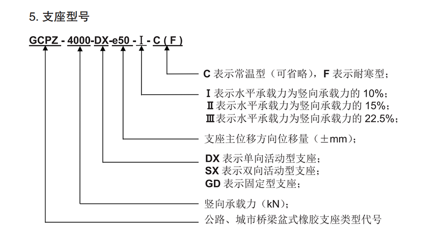 本例表示豎向承載力為 4000kN,主位移方向位移量為 ±50mm,水平承載力為豎向承載力的10%,常溫單向活動型盆式橡膠支座。該系列支座根據(jù)使用環(huán)境分普通型(一般大氣環(huán)境)和耐腐蝕型(海洋大氣環(huán)境與重度污染大氣環(huán)境),耐腐蝕支座型號后加注(NS)以做標識;如上述示例耐腐蝕型支座表示為:GCPZ-4000-DX-e50- Ⅰ -NS。